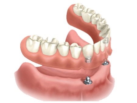 Съемные протезы на имплантах. Самый оптимальный вариант из всех возможных способов съемного протезирования при полном отсутствии зубов. Такие протезы имеют компактный размер, не перекрывают и не раздражают небо. Конструкция устанавливается на нескольких имплантах, которые соединяются балкой по типу шины.
