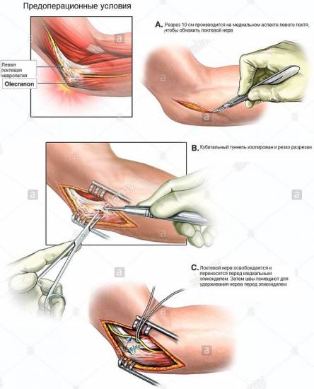 Хирургическое вмешательство (операция) показана в случае отсутствия эффекта от медикаментозных препаратов, наличия гематомы, опухоли, а также в случае развития невропатии туннельного типа.